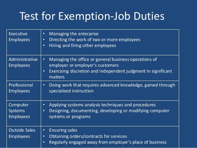 However, exempt employees must stay and finish their work, regardless of how many hours it takes. Because the FLSA does not place limits on the amount of time that an employer is allowed to require an exempt employee to work, such employees are exempt from being paid overtime. This is because it is assumed that the employee is working independently, and as such has more discretion in the execution of their tasks. An example of this would be how if the employee is involved in hiring and firing duties, they will likely be classified as exempt.